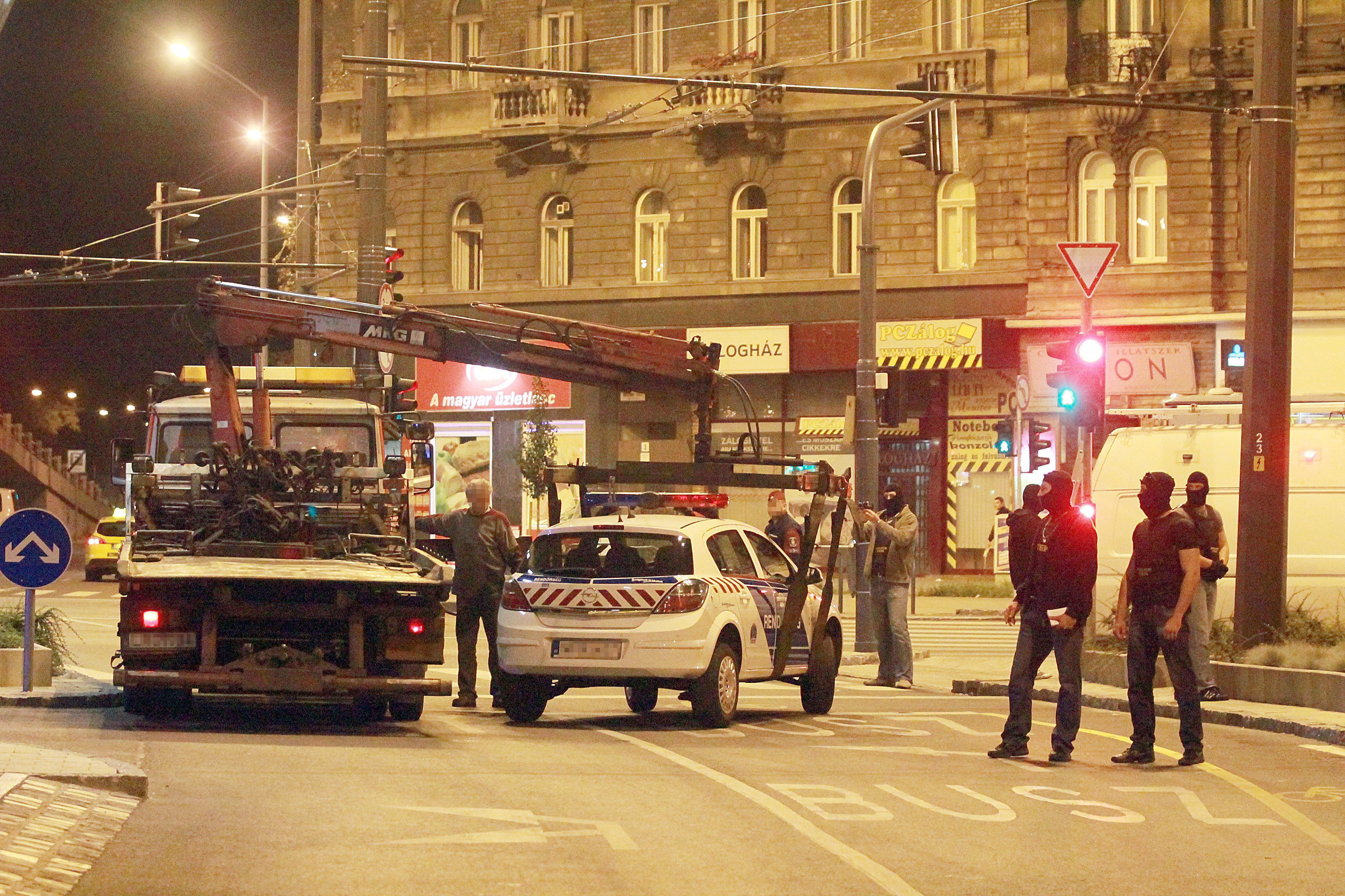 Elszállítanak egy rendõrautót Budapesten, a Baross téren, ahol a Központi Nyomozó Fõügyészség (KNYF) felkérésére szolgálatban lévõ rendõröket fogtak el a Terrorelhárítási Központ munkatársai 2014. szeptember 19-én hajnalban. Az MTI úgy tudja: a TEK azokra a rendõrökre csapott le, akik korábban a Baross téren elfogták azt a férfit, aki egy embert megsebesített, többeket pedig megfenyegetett riasztópisztollyal a fõváros VII. kerületében.