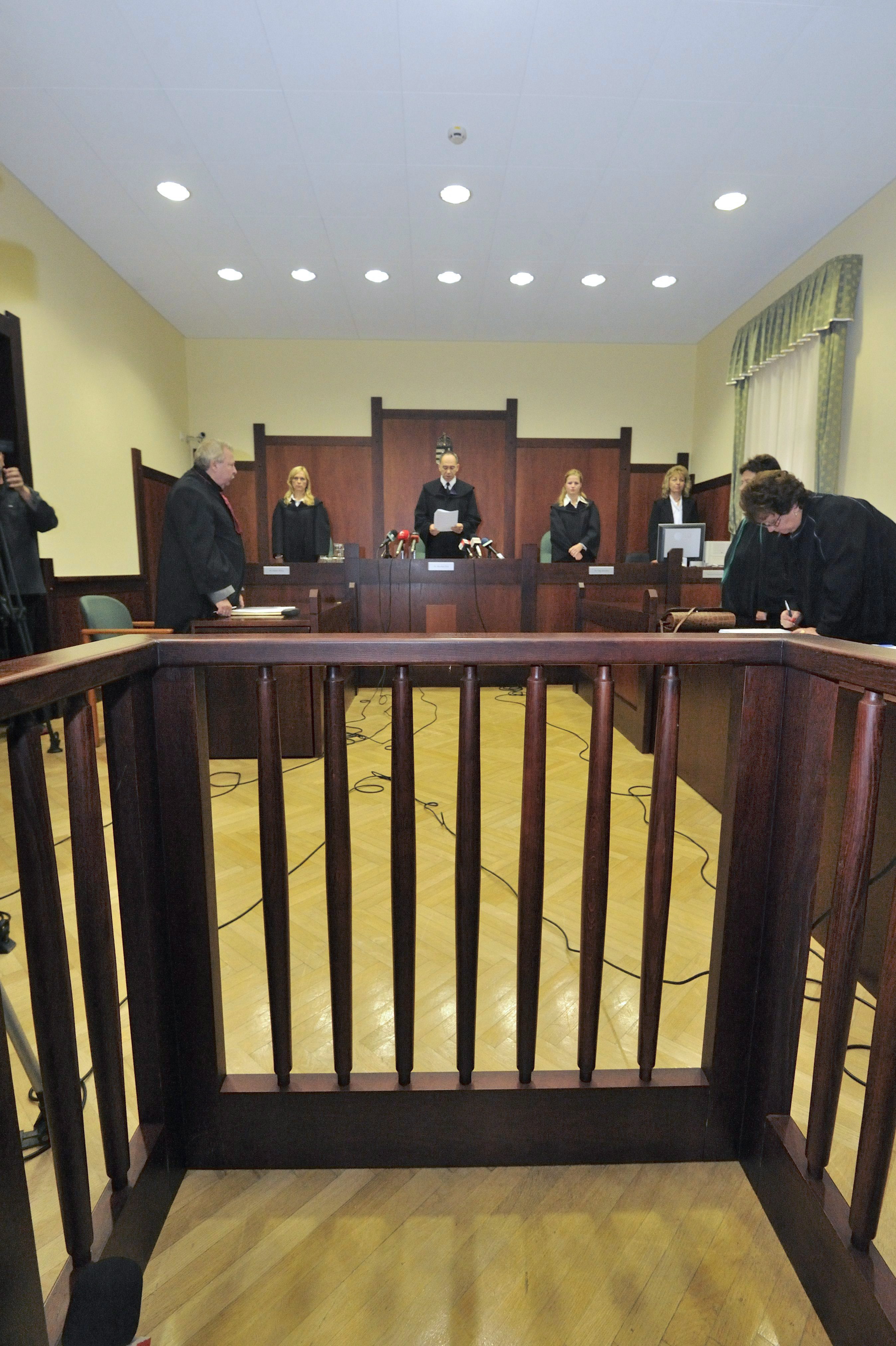 Szeged, 2014. október 3. Mezőlaki Erik tanácsvezető bíró (középen) ismerteti az ítéletét az ároktői bandaként elhíresült hat vádlott ügyében a Szegedi Ítélőtáblán 2014. október 3-án. Az ügyben kirendelés folytán eljáró bíróság a lényegi vádpontokat tekintve helyben hagyta a Fővárosi Ítélőtáblának a Fővárosi Törvényszéken januárban hozott elsőfokú ítéletét. MTI Fotó: Kelemen Zoltán Gergely