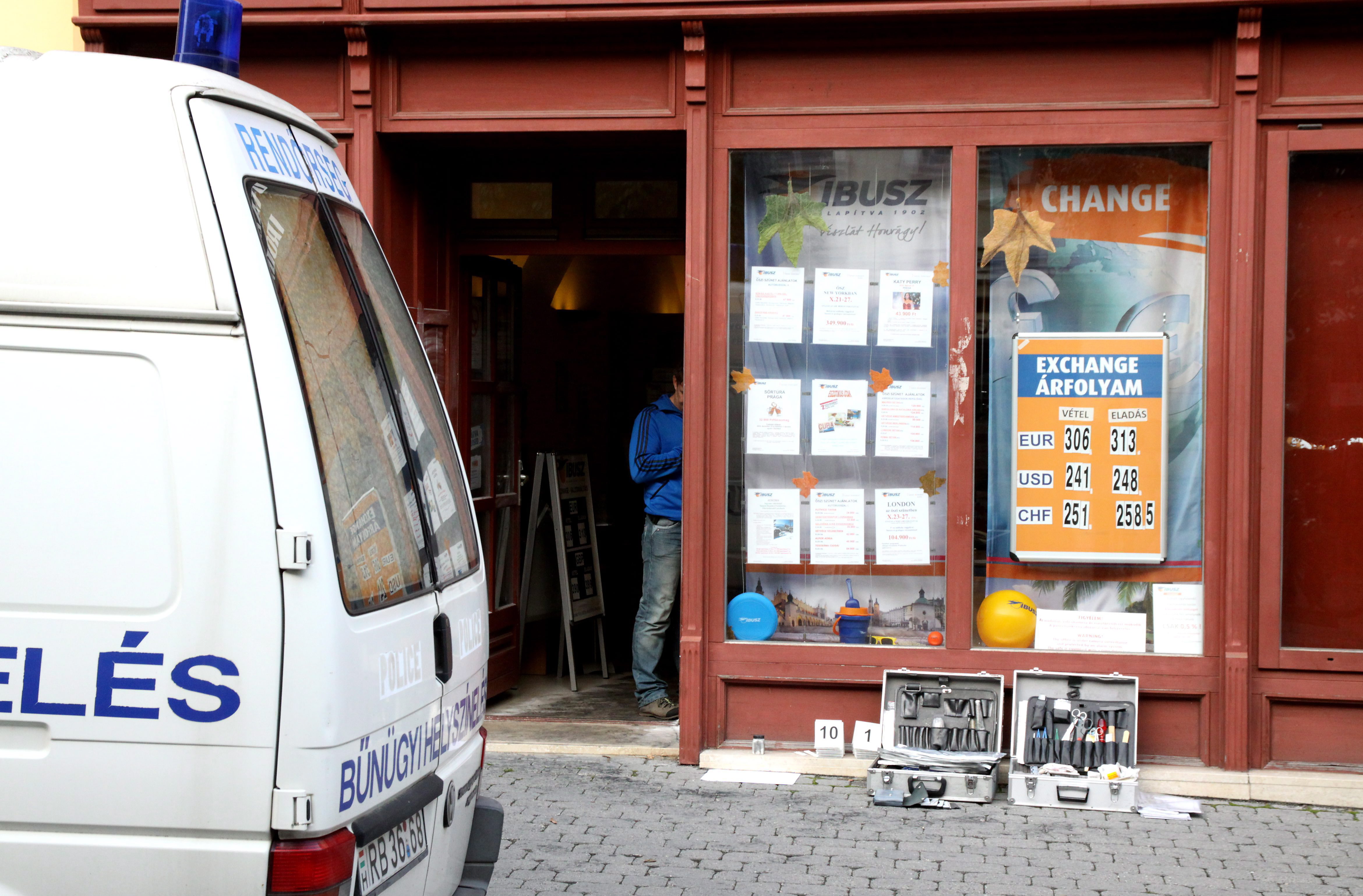 Helyszínelõk dolgoznak Veszprémben a Rákóczi utcában 2014. október 4-én, ahol fegyverrel fenyegetõzve raboltak ki egy utazási irodát. Lövés nem dördült, senki nem sérült meg. A támadó, egy férfi elmenekült a helyszínrõl.