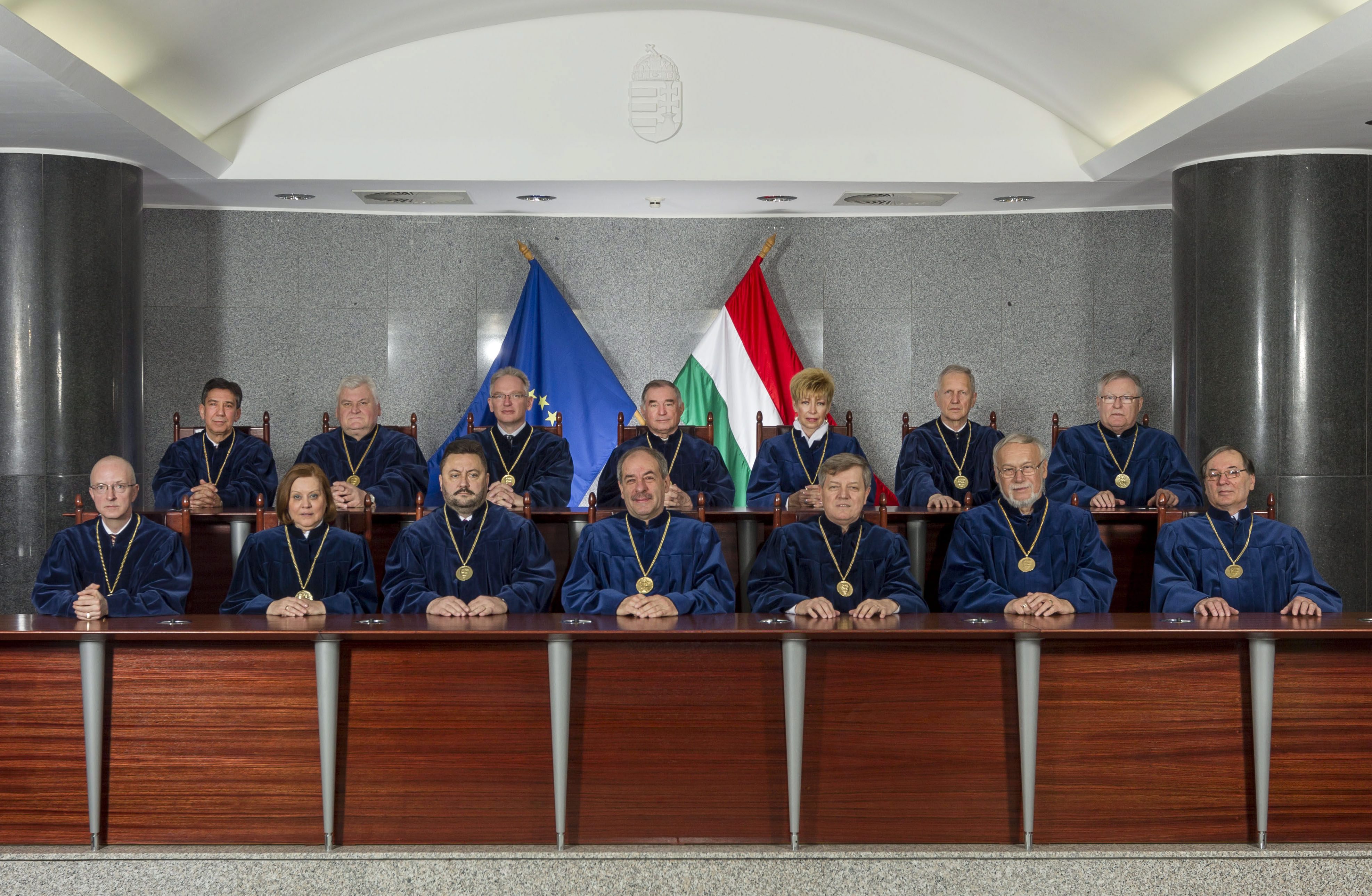 Az Alkotmánybíróság tagjai a testület székházának hirdetõtermében 2015. március 24-én. Az elsõ sor balról: Varga Zs. András, Szívós Mária, Szalay Péter, Sulyok Tamás, Stumpf István, Salamon László és Pokol Béla alkotmánybírók. A második sor balról: Lévay Miklós, Kiss László, Juhász Imre alkotmánybírók, Lenkovics Barnabás, az Alkotmánybíróság elnöke, Czine Ágnes, Dienes-Oehm Egon és Balsai István alkotmánybírók.
