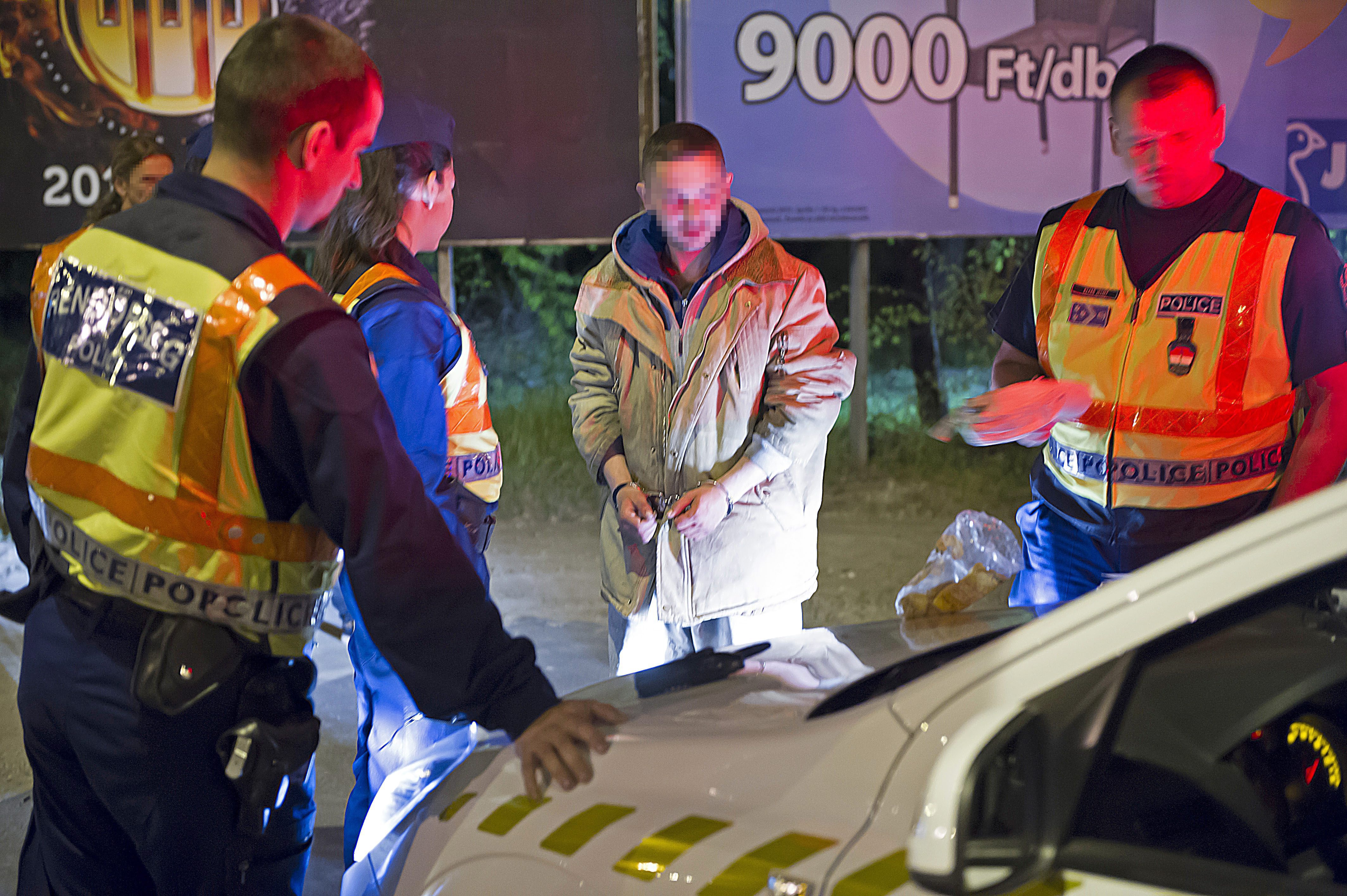 Rendõrök fognak közre egy megbilincselt kezû férfit a fõváros IX. kerületében, a Határ úton 2015. április 30-án éjszaka. A gyanúsított rátámadt és többször megütött egy fiatal nõt a villamoson. Az utasok lefogták a férfit, majd átadták a kiérkezõ rendõröknek.