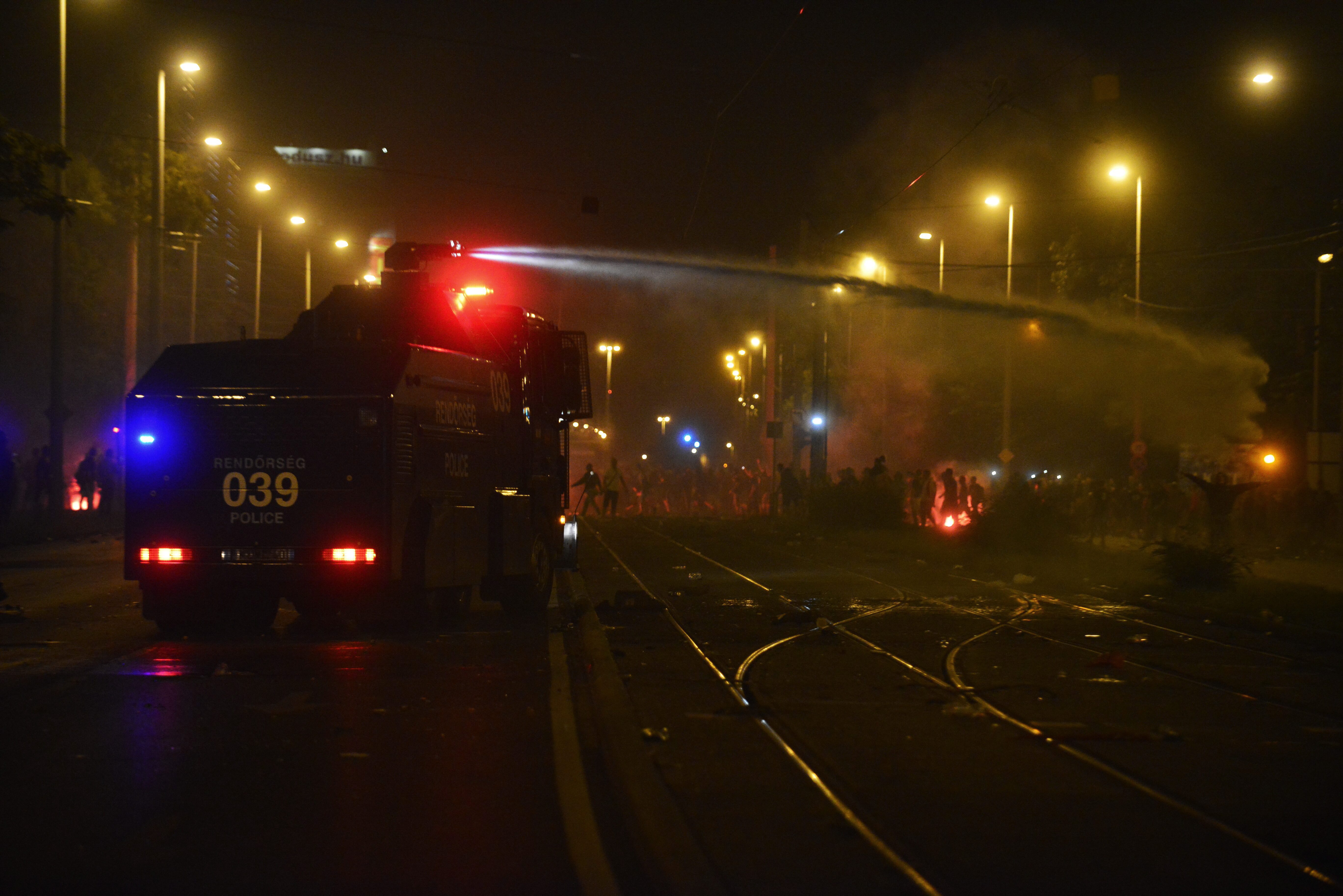 A rendõrség vízágyús autója, amelyet randalírozók ellen vetettek be a Magyarország – Románia labdarúgó Európa-bajnoki selejtezõ helyszíne, a budapesti Groupama Arénánál a mérkõzés után 2015. szeptember 4-én.